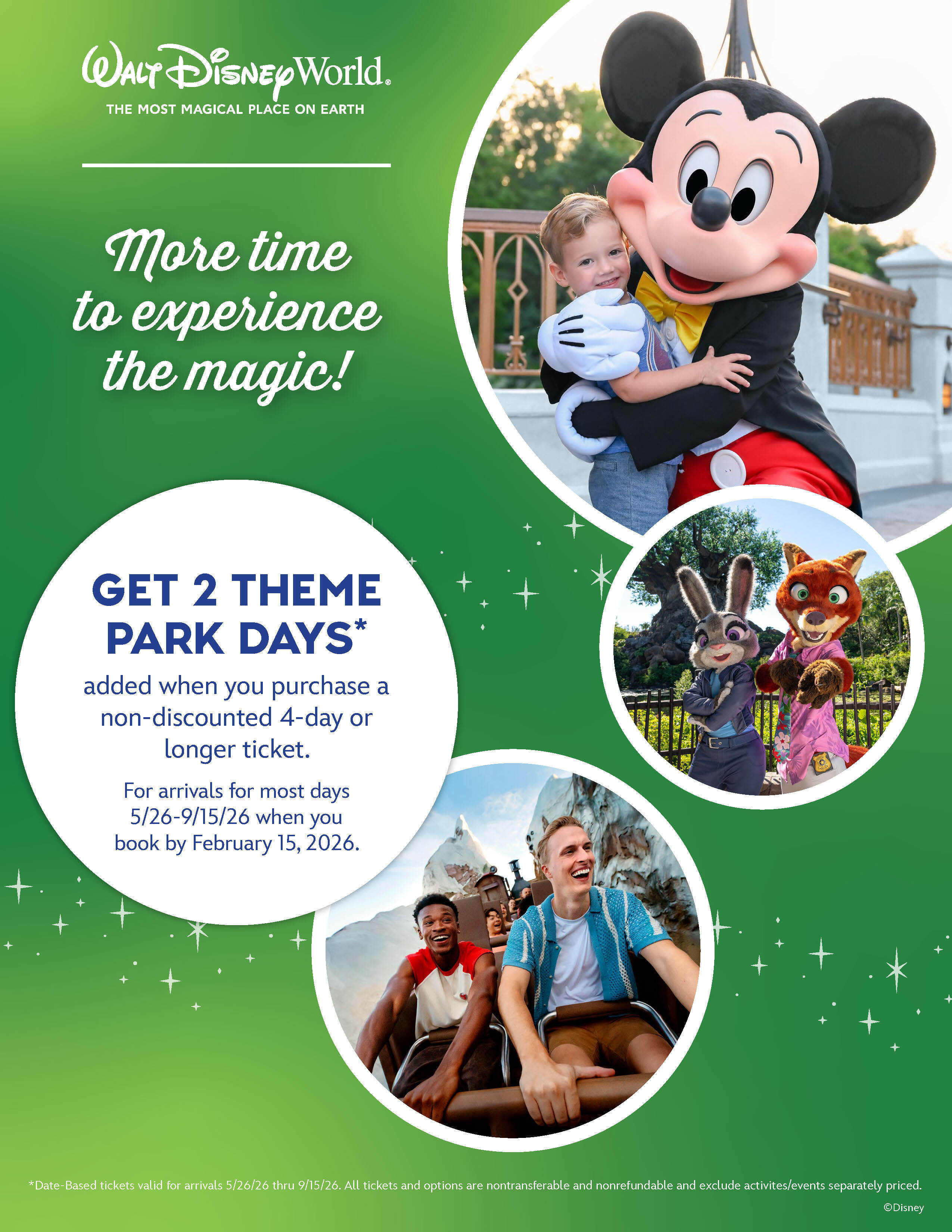 Get 2 Free Nights and 2 theme park days added when you purchase a non-discounted 4-night/4-day room-and-ticket package or longer at select Walt Disney World Resort hotels. For arrivals most nights May 26 - September 15, 2026. Book by February 15, 2026.