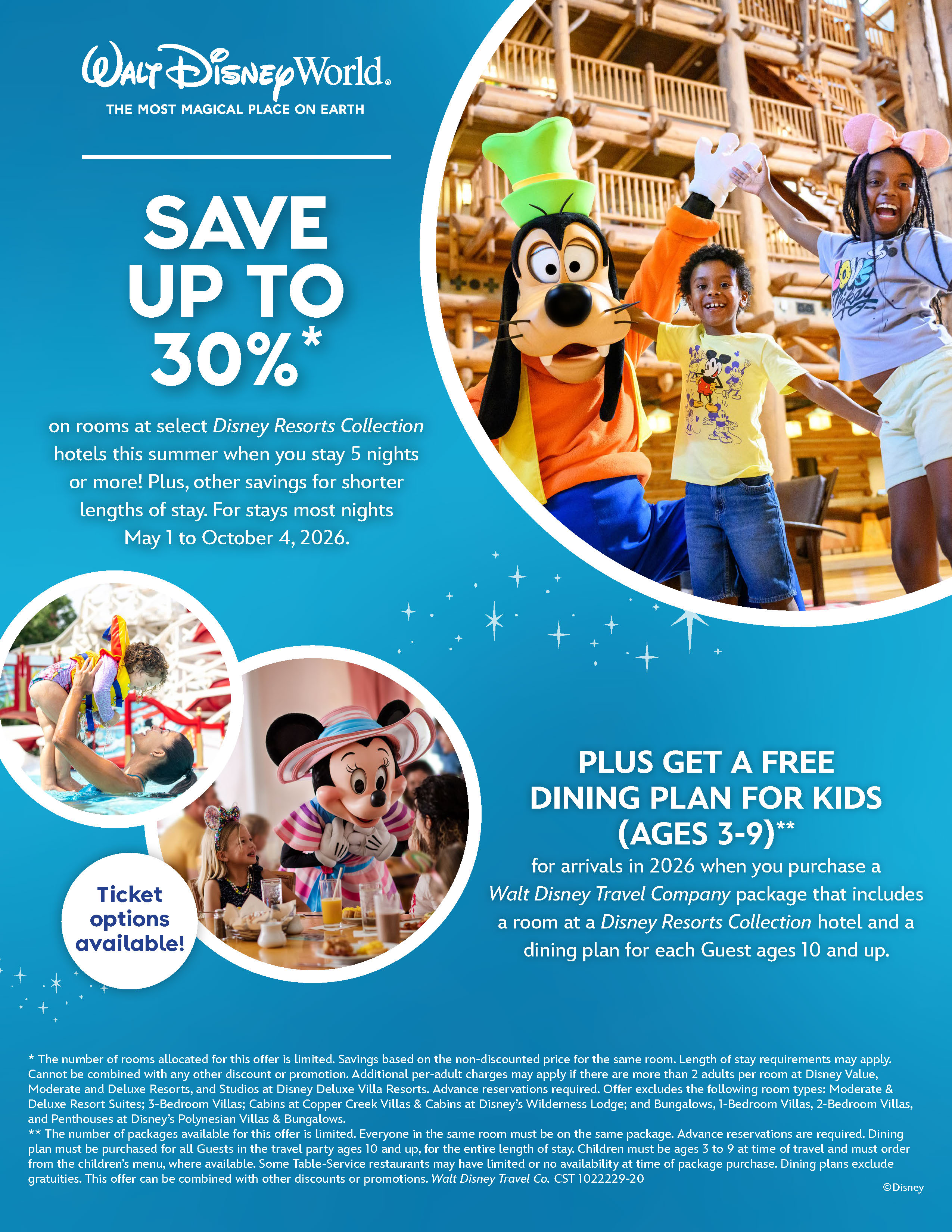 PLUS GET A FREE DINING PLAN FOR KIDS (AGES 3–9) for arrivals in 2026 when you purchase a Walt Disney Travel Company package that includes a room at a Disney Resorts Collection hotel and a dining plan for each Guest ages 10 and up.