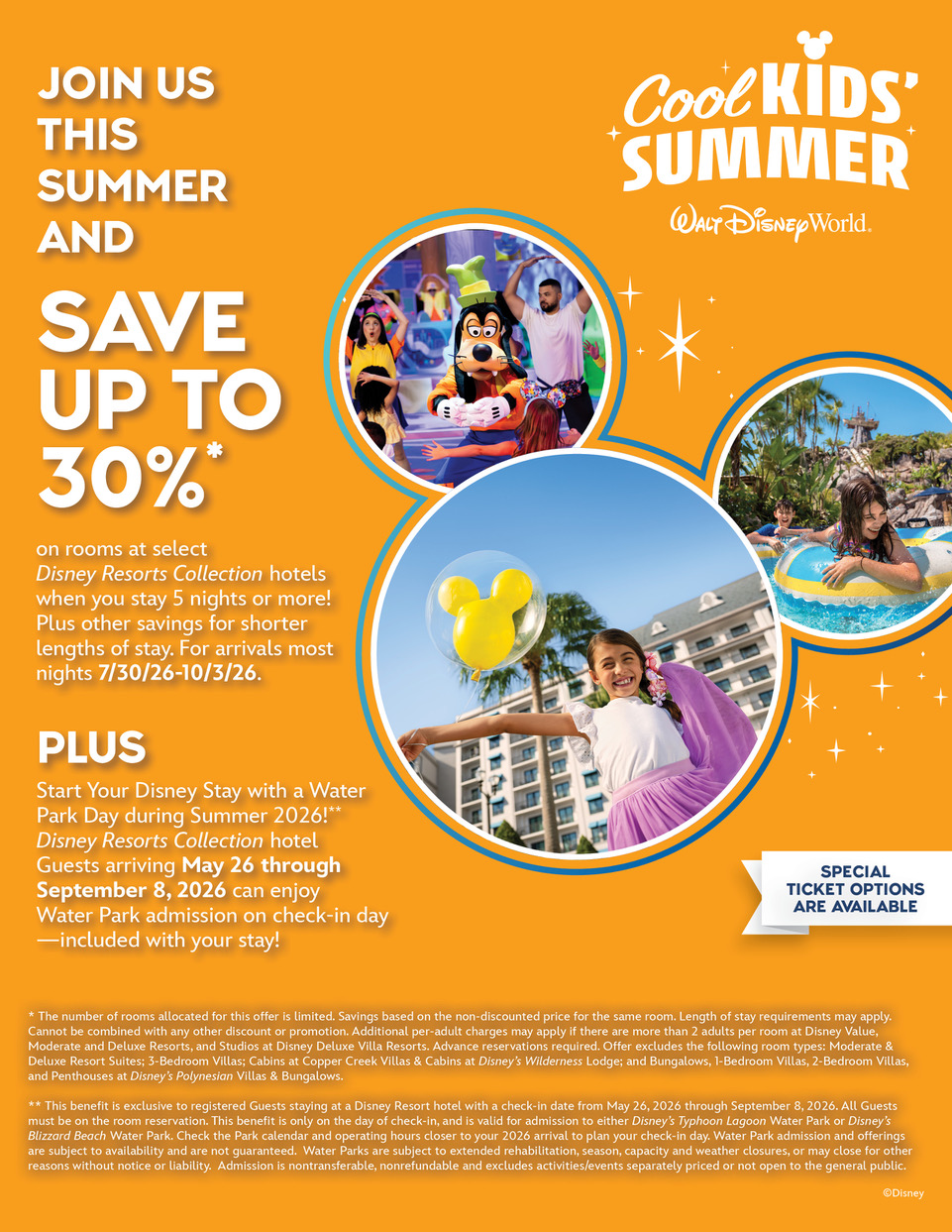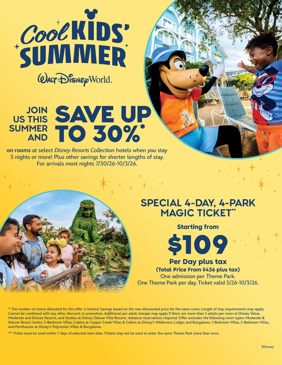 Save Up to 30% on rooms at select Disney Resort Collection hotels this summer when you stay 5 nights or more! Plus other savings for shorter lengths of stay. For stays most nights May 1, 2026 - October 4, 2026.