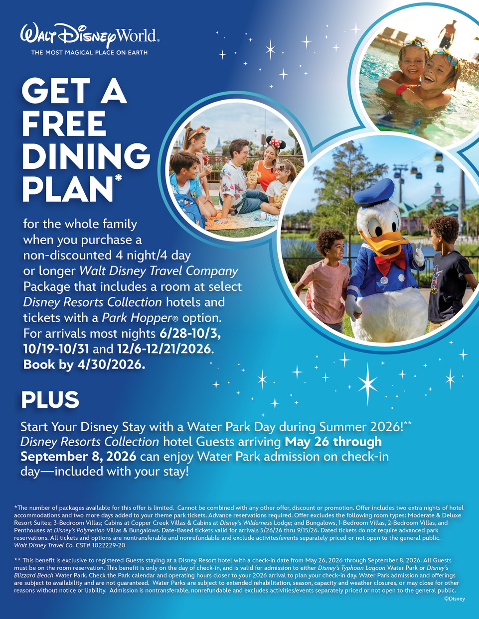 PLUS GET A FREE DINING PLAN FOR KIDS (AGES 3–9) for arrivals in 2026 when you purchase a Walt Disney Travel Company package that includes a room at a Disney Resorts Collection hotel and a dining plan for each Guest ages 10 and up.